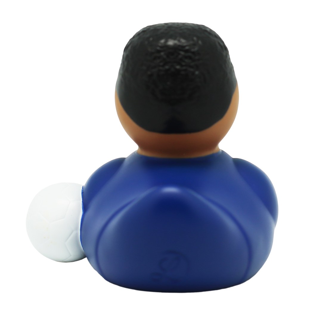 Football Star Blue Rubber Duck. Buy the champion of the Amsterdam Duck Store. This goalgetter is the legend of FC Duck Store. In brown, wearing blue jersey with black hair and white ball. Ready to kick off. Perfect gift for a football fanatic.