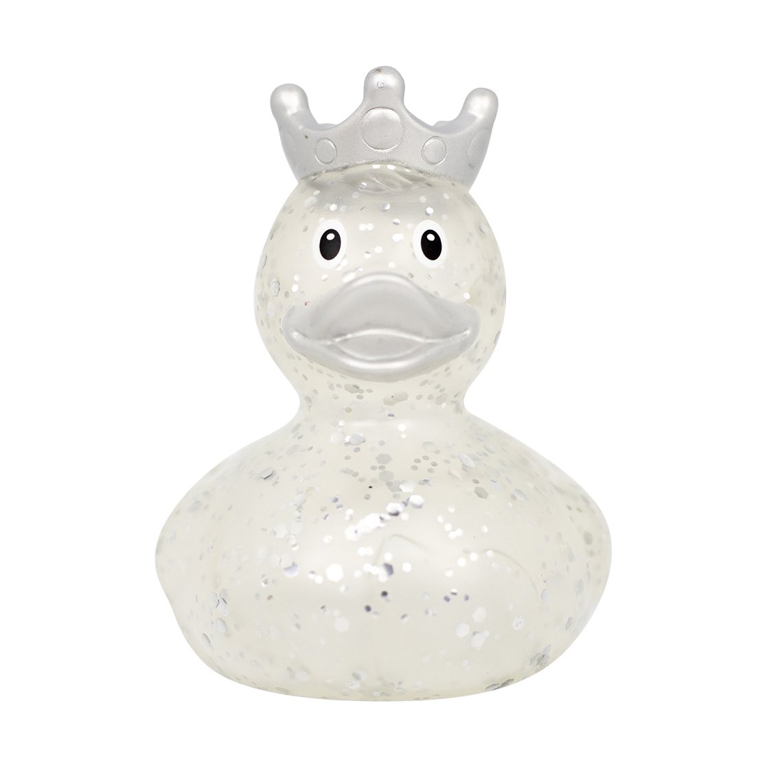 Glitter Crown Silver Rubber Duck. Buy the royal glitter duck of the Amsterdam Duck Store. This glamorous duck knows how to party in society scenes. In silver with beautiful glitters and silver crown. Give this duck to a sparkling friend.