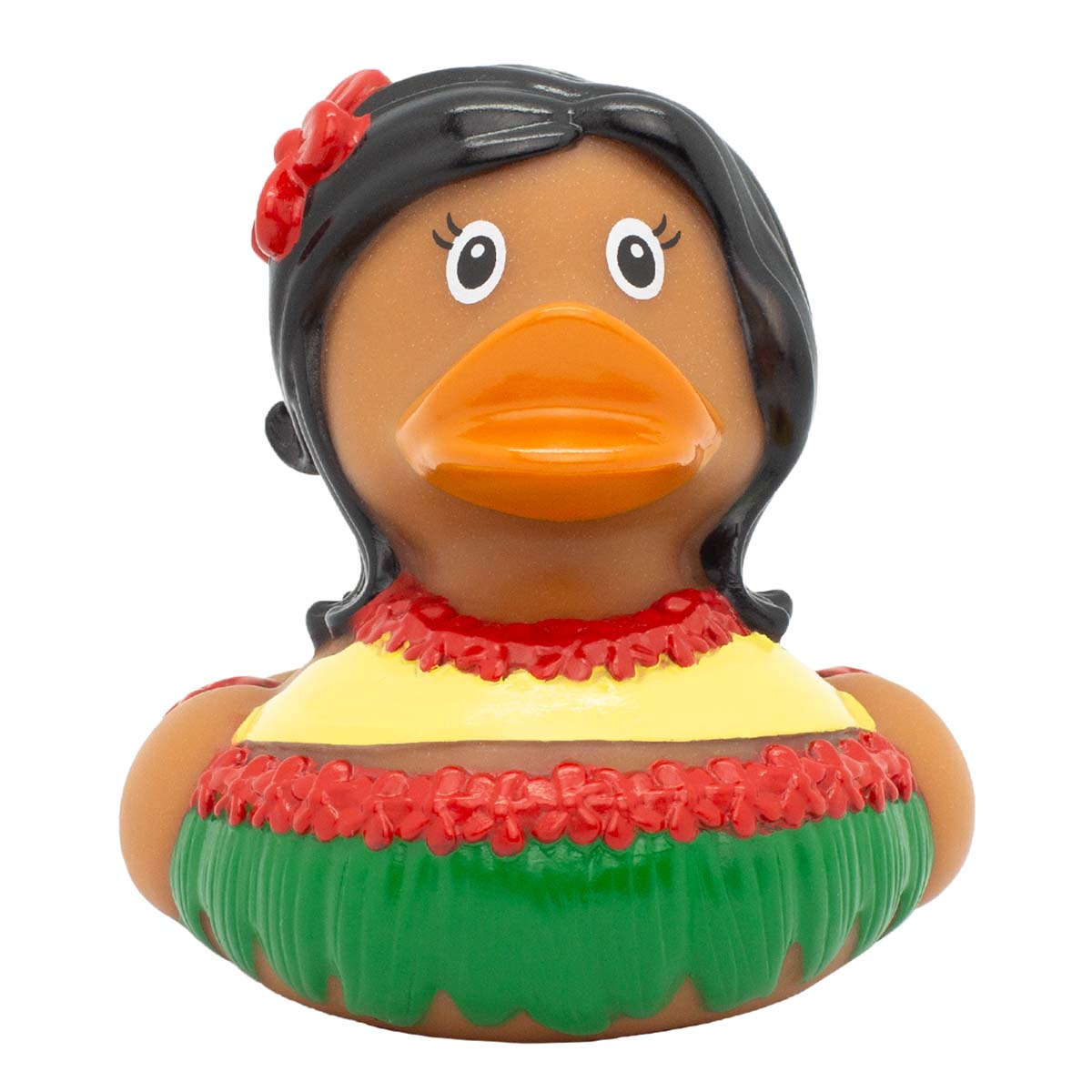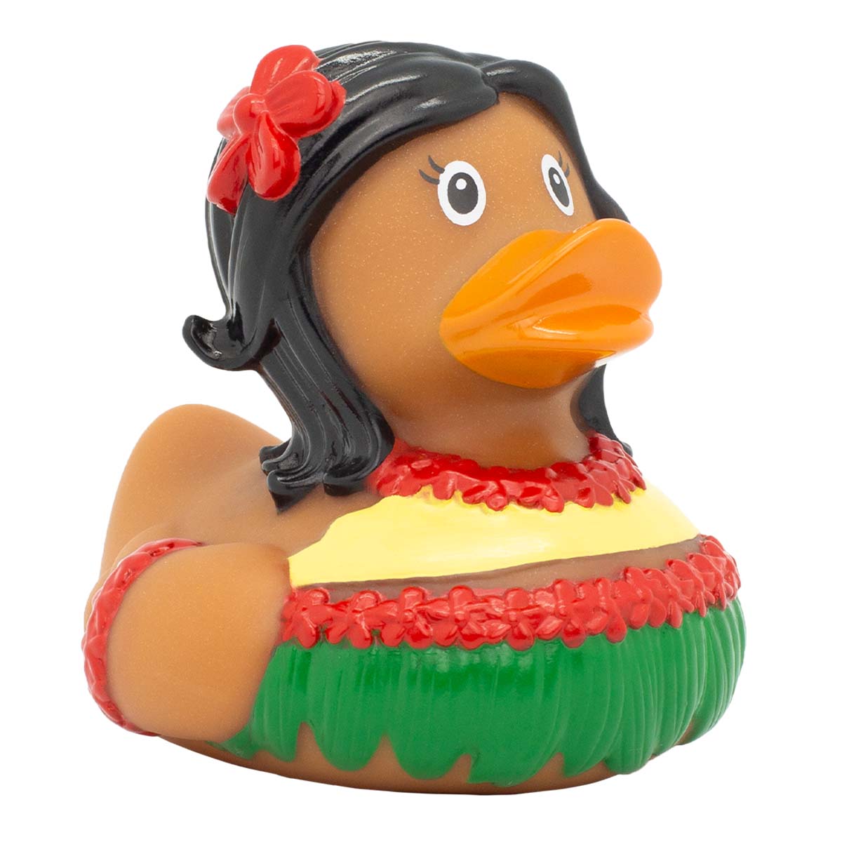 Hawaii Rubber Duck Woman. Buy the traditional Hawaiian beauty of the Amsterdam Duck Store. Wearing typical leis and costume with flowers. Ready to dance the hula. Perfect gift for a pidgin friend.