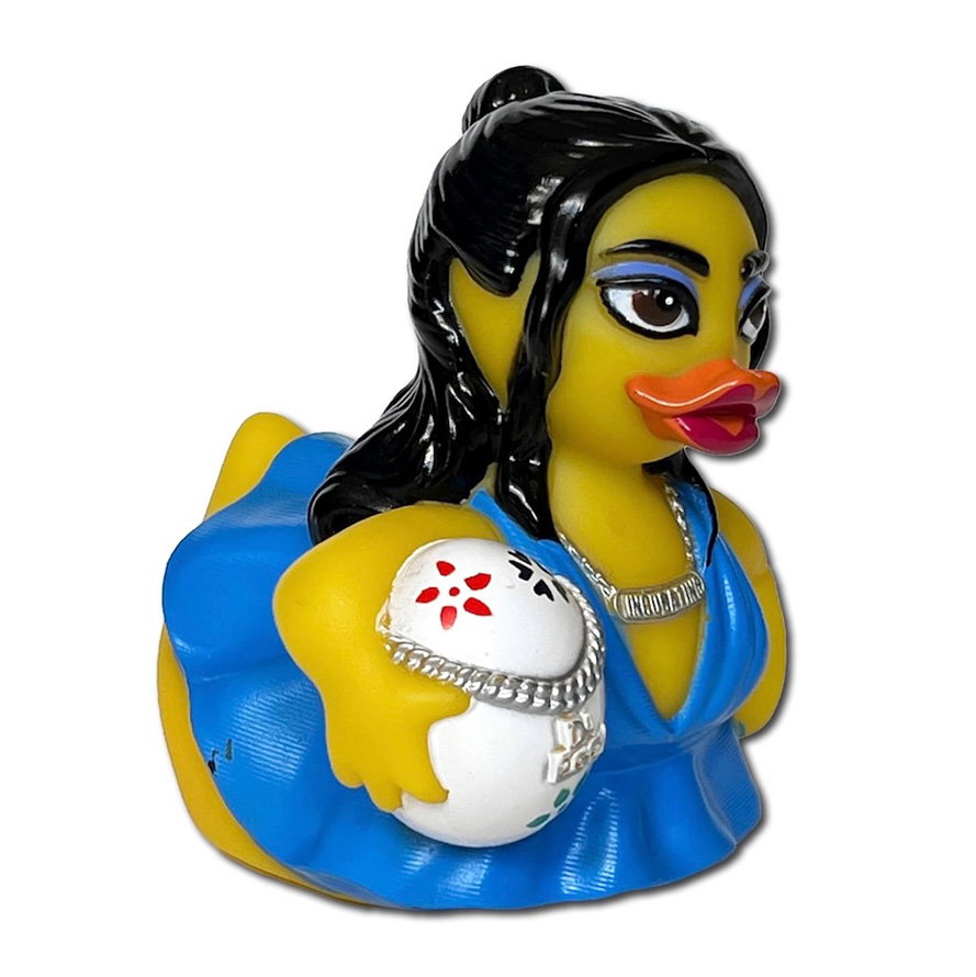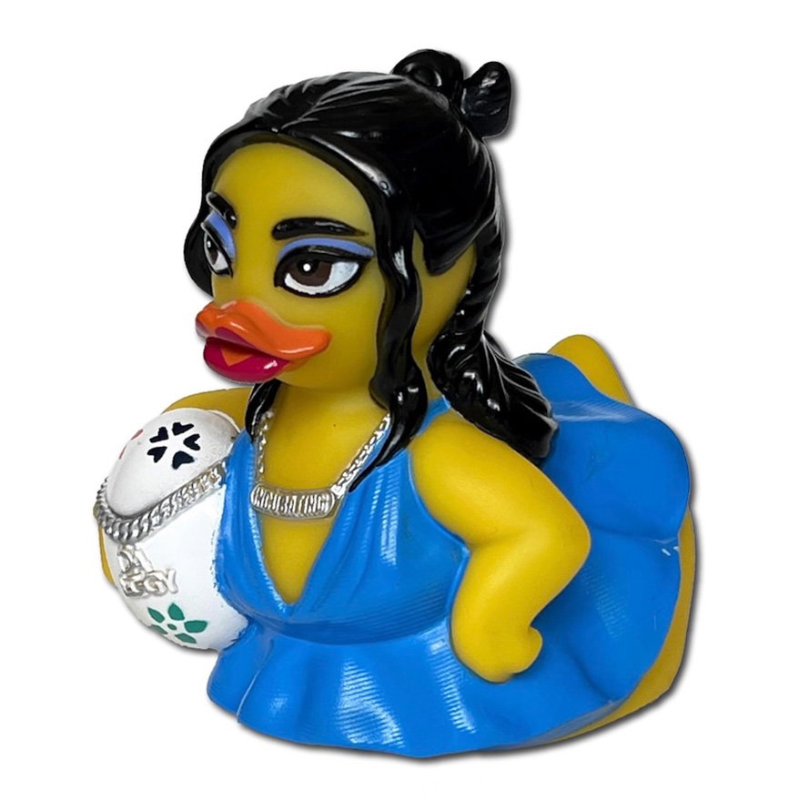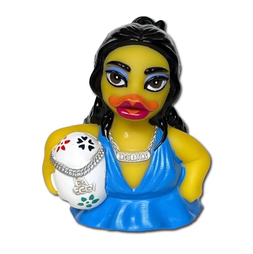 Incubating Rubber Duck. Buy the Dua Lipa duckalike of the Amsterdam Duck Store. Holding a white egg symbolizing falling in love. Wearing a blue dress and necklace with incubating print. With red lips and black hair, ready to perform another great concert. Give this duck to a real fan of the famous popstar.
