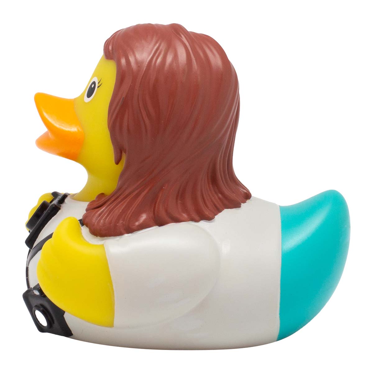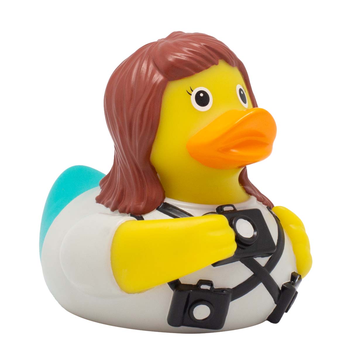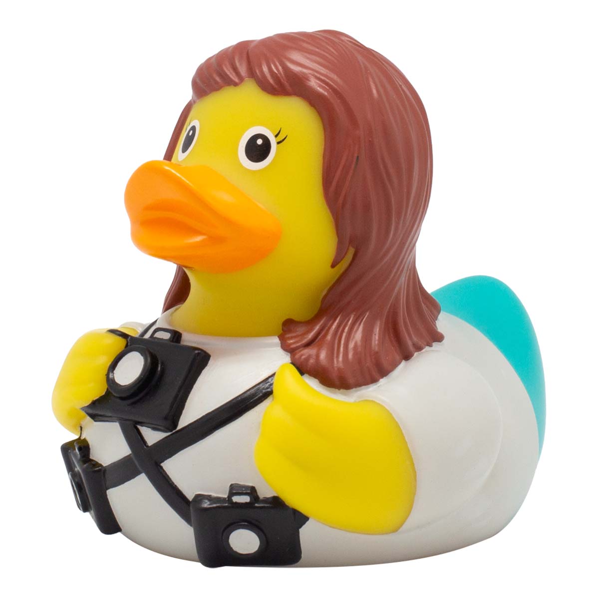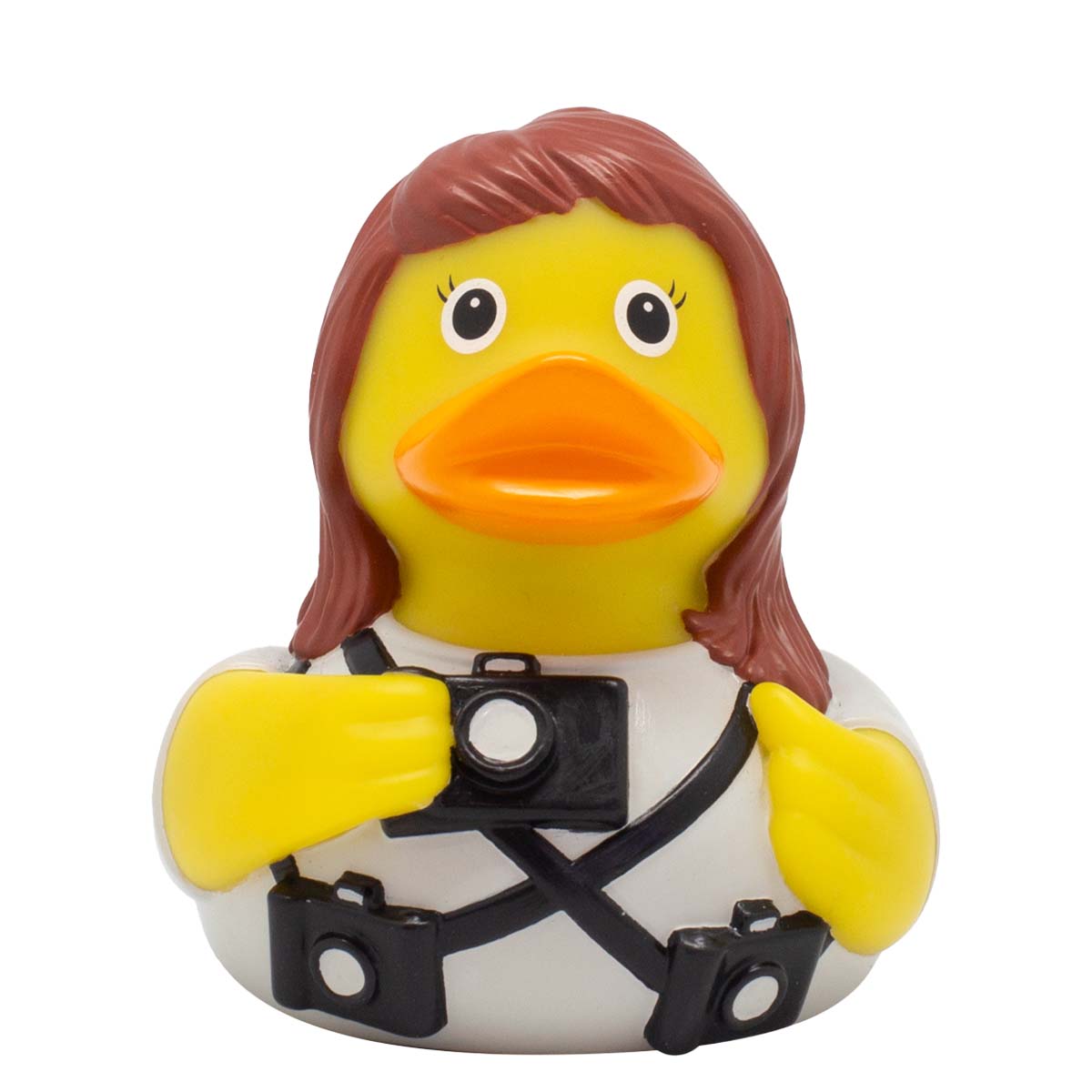 Photographer Female Rubber Duck. Buy the shooting star of the Amsterdam Duck Store. With three cameras makes sure she gets the right picture at the right moment. Wearing a white shirt, with brown long hair. Give this duck to paparazzi friend.
